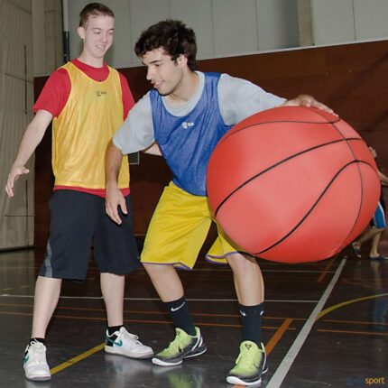 Bola de basquetebol de tamanho superior ao habitual, especialmente concebida para tornar o jogo mais acessível e motivador para todos. Pode ser utilizada para marcar pontos em cestos, fazer contacto com os painéis ou fazer ressaltos numa parede. Revestimento em nylon super resistente e câmara interior em látex. Inclui câmara de substituição. · Diâmetro: 55 cm · Peso: 500 g