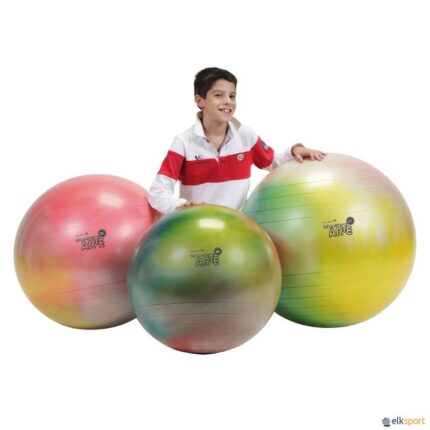Bola gigante da Gymnic fabricada em vinil decorado, com um nível de flexibilidade semelhante ao das bolas gigantes, mas com o sistema BRQ anti-explosão — em caso de furo, a bola esvazia-se lentamente. Este sistema é eficaz com um peso máximo de 120 kg. · 3 Diâmetros: 55 cm / 65 cm / 75 cm.