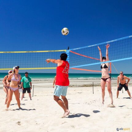 Conjunto de Postes de Vólei de Praia Transportáveis Conjunto robusto e de fácil montagem para a prática de vólei de praia. Ideal para uso recreativo, escolar ou competitivo, este kit completo inclui todos os elementos necessários para uma instalação rápida e segura. Composição do conjunto: · 2 postes telescópicos em alumínio com 5,5 cm de diâmetro, ajustáveis em 3 alturas oficiais: – 2,35 m (masculino) – 2,30 m (misto) – 2,24 m (feminino) · Corda dupla de fixação com anéis de tensão para ajuste firme dos postes. · Corda de marcação do campo com sistema de fixação nos cantos. · Rede oficial de 9,5 m, com banda lateral de reforço para maior durabilidade. · Enrolador de rede. · Ancoragens de fixação em aço para garantir estabilidade no terreno. · Saco de transporte em nylon para armazenamento.