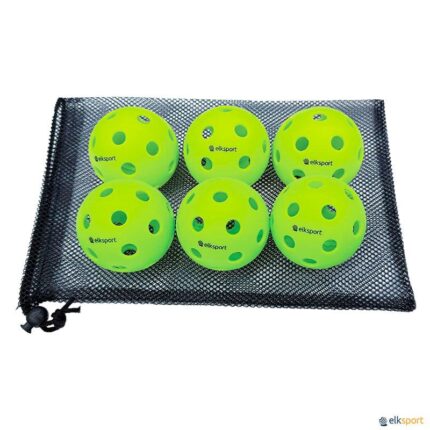 Bola para pickleball desenhada especificamente para jogos em interior. Estas bolas oferecem um voo preciso e um excelente ressalto. Construídas com materiais de alta qualidade que mantêm a sua forma após cada pancada. A bola de pickleball para interior possui 26 perfurações que lhe conferem leveza tanto no voo como no ressalto. A sua cor amarelo néon proporciona uma excelente visibilidade. · Cor: amarelo néon. · Perfurações: 26. · Diâmetro: 7,3 cm. · Peso: 25 g. Vendido em lote de 6, com bolsa em rede. Ver também as bolas para exterior J10790.