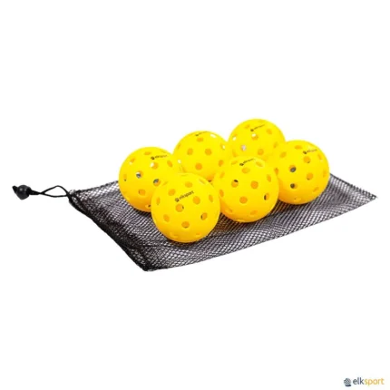 Bola para pickleball desenhada especificamente para jogos em exterior. Estas bolas oferecem um voo preciso e um excelente ressalto. Construídas com materiais de alta qualidade que mantêm a sua forma após cada pancada. A bola de pickleball para exterior possui 40 perfurações que lhe conferem leveza tanto no voo como no ressalto. A sua cor amarelo néon proporciona uma excelente visibilidade. · Cor: amarelo · Perfurações: 40 · Diâmetro: 7,3 cm . Altura de ressalto : 86-96 cm · Peso: 26 g. Vendido em lote de 6, com bolsa em rede. Ver também as bolas para interior J10792.