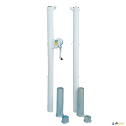 Postes de Pickleball em conformidade com norma UNE-EN 1510, em ferro ou alumínio. Postes de ferro: tubo de ferro pintado de secção redonda de Ø 80 mm. Tensão da rede por polia e manivela. Mangas de fixação e tampas incluídas.