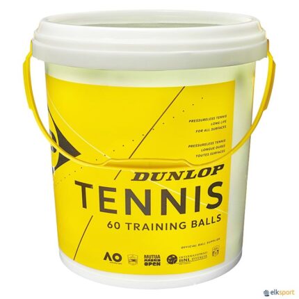 Balde com 60 bolas de ténis Dunlop Training. Graças à sua fabricação com menor pressão, nunca esvaziam, sendo a bola de ténis ideal para treino, pois garante um jogo homogéneo e uma grande durabilidade. · Muito boa durabilidade para escolas, boa sensação ao bater na bola. · Acondicionadas num balde para armazenamento e transporte mais cómodos.