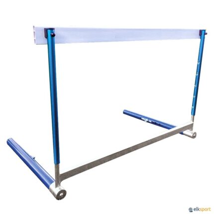 Barreira de competição e treino de alta qualidade. Parte superior feita de tubo redondo de alumínio anodizado na cor azul brilhante, , base em tubo de aço redondo pintado a pó de azul vivo. Alturas facilmente ajustáveis. Fasquia da barreira em plástico. 5 Alturas: 76,2 – 83,8 – 91,4 – 99,1 e 106,7 cm. Largura: 120 cm.