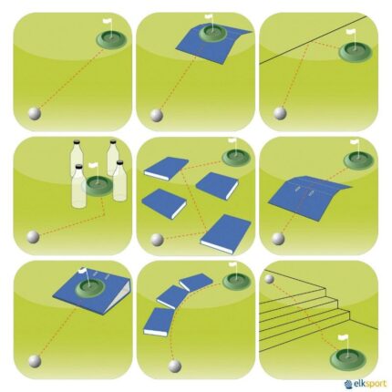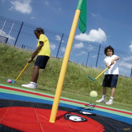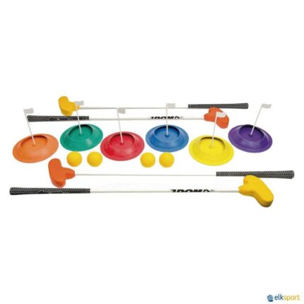 Perfeito para introduzir o golfe de forma lúdica e segura, este conjunto foi pensado para ser utilizado em qualquer espaço, tanto no interior como no exterior. Kit Composto por: 6 buracos em 6 cores diferentes, com orifício de 10 cm de diâmetro 6 bandeiras amovíveis para identificação das estações 4 tacos de golfe DOM tipo putter 4 bolas de iniciação ao golfe