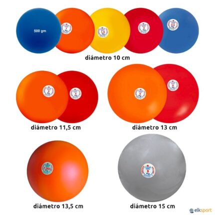 Os únicos pesos de atletismo inelásticos, ideais tanto para a iniciação como para a competição. Fabricados em borracha macia elástica reticulada, são pesos seguros e não tóxicos. Não ressaltam ao cair no chão, podendo ser utilizados tanto em interiores como no exterior. Estes pesos de atletismo são uma excelente ajuda para os jovens desenvolverem as técnicas corretas de lançamento. 11 Pesos Disponível em 11 pesos: · 500 g (10 cm de ø) · 1 kg (10 cm de ø) · 1,5 kg (10 cm de ø) · 2 kg (10 cm de ø) · 2,5 kg (10 cm de ø) · 3 kg (11,5 cm de ø) – certificado pela World Athletics · 4 kg (11,5 cm de ø) – certificado pela World Athletics · 5 kg (13 cm de ø) · 6 kg (13 cm de ø) · 7,265 kg (13,5 cm de ø) · 9 kg (15 cm de ø) O peso de atletismo de 9 kg representa uma novidade no mercado: é fabricado com um novo composto e com dupla camada super resistente, destinado ao treino de reforço para atletas profissionais.