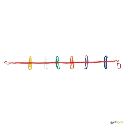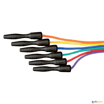 Corda para saltar de grande resistência e com um pouco mais de peso do que as cordas de vinil, graças aos segmentos de plástico que envolvem toda a corda e que fazem com que esta rode mais lentamente. O som que emite ao bater no chão ajuda os saltadores a manter um ritmo regular, sendo ideal para saltar em grupo. · Conjunto composto por 6 cordas: de cor branca em combinação com 6 cores (amarelo, azul, laranja, vermelho, verde e violeta). · Comprimento: 2,5 m.