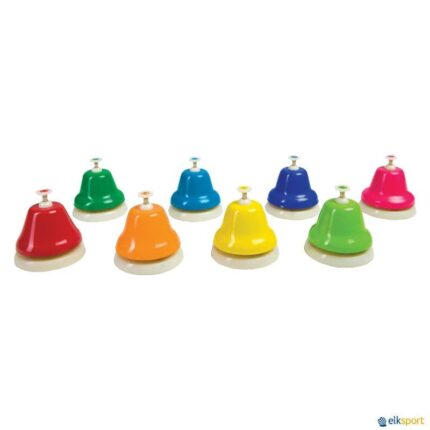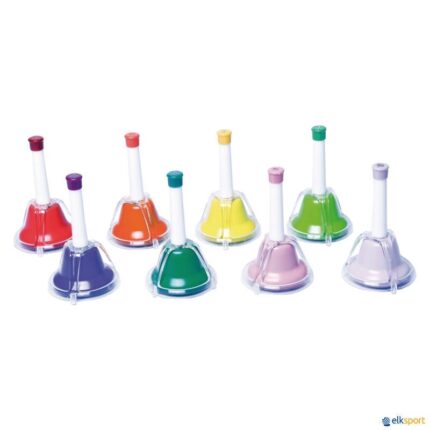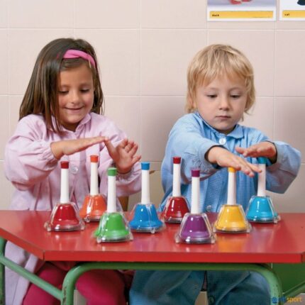 Conjunto de 8 campainhas musicais com cabo, perfeitamente afinadas. Escala diatónica. Com um sistema inovador de dupla percussão, através do cabo tradicional e por pressão. Inclui livrinho musical. · Altura: 13 cm · Diâmetro: 8 cm