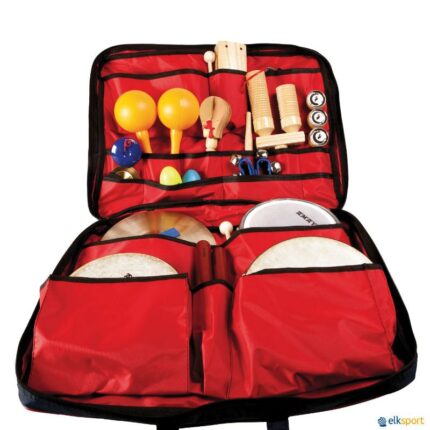 Conjunto composto por: 1 Bolsa. 1 Par de pulseiras com guizos. 1 Sambino triplo. 1 Par de Castanholas com cabo de madeira. 1 Castanholas pequenas plásticas. 2 Chocalhos grandes. 1 Ferrinho 15 cm. 1 Pandeireta de 15 cm de ø 1 Pandeireta de 21 cm de ø. 1 Mini crótalo. 1 Crótalo 20 cm. de ø 1 Raspa. 1 Par de claves de madeira. 1 Caixa chinesa. 1 Tambor 17 cm de ø. 1 Cinto com guizos. 1 Par de maracas de plástico. 1 Par de ovos sonoros.
