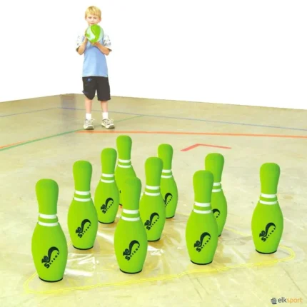 Pinos em espuma de alta densidade de 38 cm de altura para tornar o jogo mais real. Jogo de pinos em espuma praticamente indestrutíveis, macios e seguros (para jogadores, paredes, móveis, etc.) mas pesados. Na bola, uma das características que destacamos é a sua capacidade para absorver e dissipar os impactos dos lançamentos. O conjunto é formado por: 10 pinos de 36 cm de altura + 1 bola de 605g e 16,5 cm Ø + 1 base em vinil para ajuda na disposição dos pinos +1 bolsa para guardar e transportar. Existe a possibilidade de adquirir uma bola sobresselente  ref J10489  BOLA EXTRA DE BOWLING SUPER para mais proatividade durante a partida.
