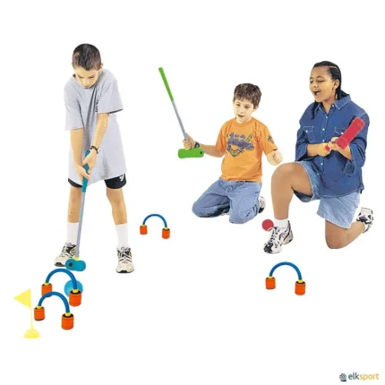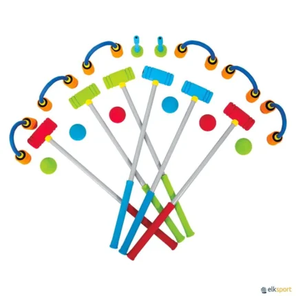 Kit de croquet super seguro (SS) em que as bolas e as maças são de espuma. Ideal para jogar no interior. O conjunto é composto por: - 6 maças e 6 bolas com 6 cores diferentes: vermelho, verde, azul, amarelo, laranja e violeta, - 6 portas de 15 cm de altura por 15 cm de largura, - 2 pivôs: saída e chegada