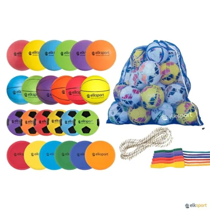 Para alunos no recreio e nos tempos livres. Kit composto por:  6 Bolas futebol super suaves 6 Bolas minibasquetebol super suaves 6 Bolas de voleibol super suaves 6 Cordas polipropileno com pegas 6 Discos voadores 1 Corda para saltar em grupo 10 m 1 saco para as bolas Todos os componentes podem ser adquiridos separadamente.