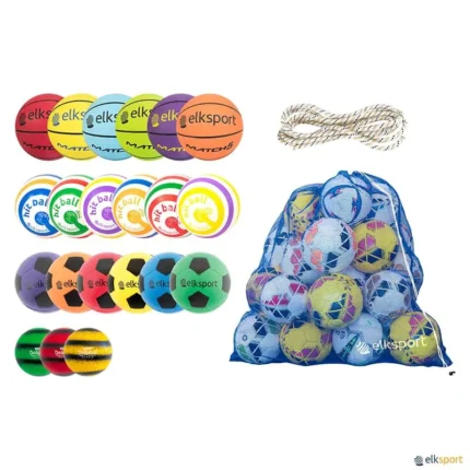 Para alunos no recreio e nos tempos livres. Kit composto por:  6 Bolas futebol super suaves 6 Bolas basquetebol Match 6 Bolas Hit Ball 3 Bolas Dodgeball/Datchball 1 Corda para saltar em grupo 10 m 1 saco para as bolas Todos os componentes podem ser adquiridos separadamente.