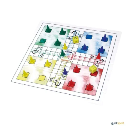 Tela de 1,2 x 1,2 m com esquema de jogo impresso. Para jogar com 2 a 4 jogadores em simultâneo. O jogo é formado por: 16 fichas de 10 cm de altura e 5 cm na base, em 4 cores e 2 dados. Também existe em tabuleiro de mesa JOGO DO GANSO ou JOGOS DE TABULEIRO.