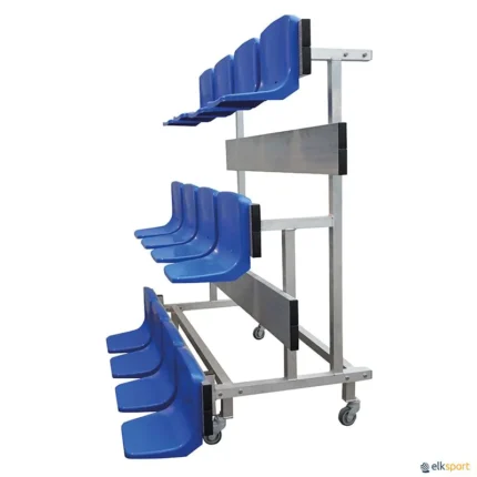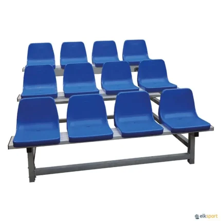 Fabricada totalmente em alumínio, cada uma das plataformas possui superfície antiderrapante para maior segurança. Está equipada com rodas giratórias, com e sem travão, para facilitar o transporte e armazenamento. Adequada para utilização em espaços interiores e exteriores. Graças á sua construção completamente em alumínio, é especialmente indicada para uso em piscinas, devido à sua tolerância à água e ambientes húmidos. Quando não esta em uso, ocupa pouco espaço. Basta levantar e a base de apoio passa a ser somente de 130 cm e pode ser arrumada. Capacidade: até  12 espectadores repartidos em 3 filas. Os 4 assentos de cada fila têm 30 cm de altura, fabricados em polipropileno (PP) de alta qualidade e resistentes aos raios UV. É fornecida desmontada. Dimensões : 200 x 200 x 130 cm  - Peso: 110 kg. Ver também modelo SEM assentos : BANCADA AMOVÍVEL