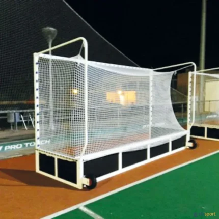 Fabricada conforme norma europeia UNE-EN 750: 2004/AC: 2006. Em aço de perfil quadrado 50 x 50 mm e cantos arredondados, com duplo tratamento, galvanizado e pintado. Interior com painéis laterais e fundo em contraplacado e revestidos de relva sintética. Rodas pneumáticas de 260mm de diâmetro. Venda à unidade. Rede não incluída. Transporte não incluido, consultar portes envio. Redes de polipropileno malha 35mm, Linea Oro vendidas à parte, ver REDES BALIZAS HÓQUEI EM CAMPO.