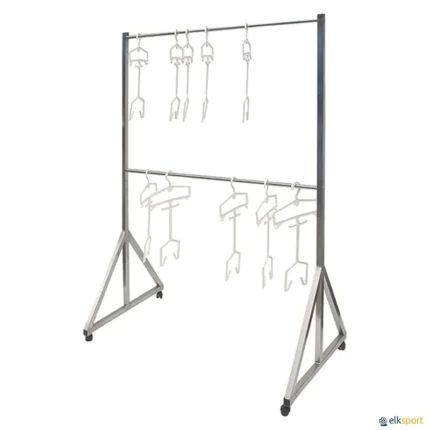 Suporte de cabides em aço inox AISI-304, com 2 barras, equipado de 4 rodas giratórias, 2 delas com travão. De grande capacidade, permite pendurar os cabides curtos e compridos. Dimensões : Largura 165 cm - Altura 220 cm. Ver CABIDE / CRUZETA DE BALNEÁRIO INDIVIDUAL .