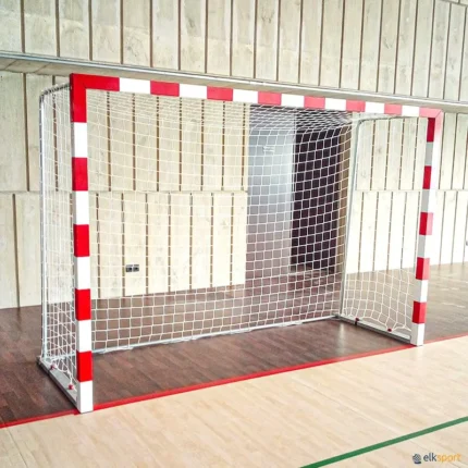 Baliza de andebol fabricada em perfil de ferro, de secção quadrada de 8 x 8 cm, lacada vermelho e branco. Em conformidade com a norma UNE-EN 749.