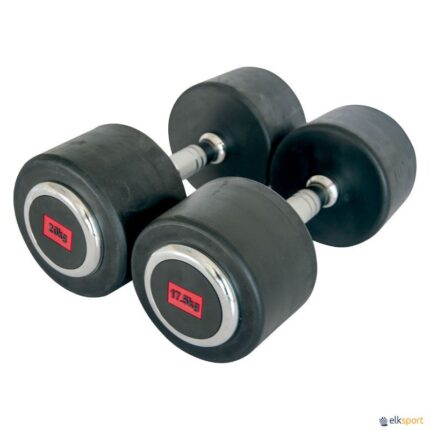 Halter com pega ergonómica e tratamento em crómio para maior durabilidade e melhor aderência. Este halter é ideal para exercícios de força tanto em ginásios como em casa. Graças ao seu revestimento em borracha, não danifica o chão nem produz ruído. · Disponível em 7 pesos: 5 kg / 7,5 kg / 10 kg / 12,5 kg / 15 kg / 17,5 kg / 20 kg. Vendidos à unidade.