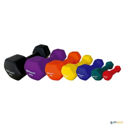 Par de halteres hexagonais fabricados em ferro revestido a neoprene, um material agradável ao tato, muito confortável e bastante durável.