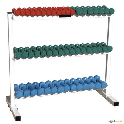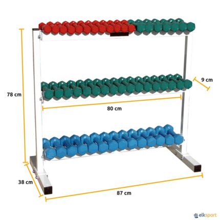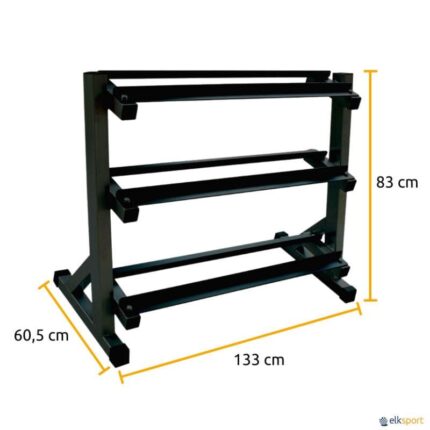 Estante para armazenar halteres hexagonais de borracha. A estante não inclui os halteres hexagonais de borracha. Dimensões: 133 x 60,5 x 83 cm.