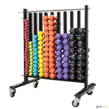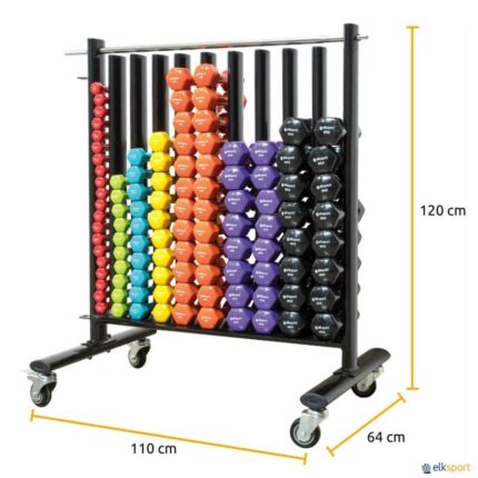 Móvel para armazenar halteres de aço, com rodas para facilitar o seu transporte. · Capacidade: 100 halteres de vinil · Comprimento: 110 cm · Largura: 64 cm · Altura: 120 cm