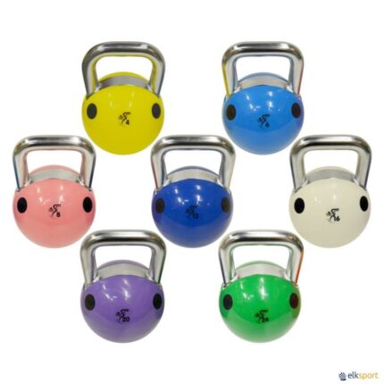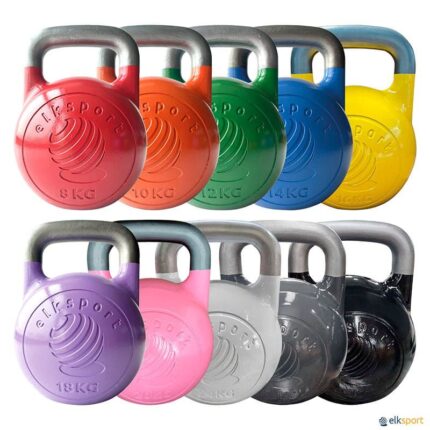 As kettlebells ou pesos russos são uma ferramenta ideal para o treino de força, potência explosiva, resistência, coordenação, equilíbrio e flexibilidade. Além disso, são de grande utilidade em trabalhos de prevenção e reabilitação de lesões. A sua principal característica em relação a outras ferramentas de treino é que a carga das kettlebells varia constantemente, permitindo trabalhar vários grupos musculares em simultâneo. Kettlebell de competição fabricada em aço, com uma pega especial sem pintura que facilita os movimentos, bem como a utilização de magnésio. Todas as kettlebells têm a mesma forma e medidas, independentemente do peso, embora cada uma apresente uma cor distinta para facilitar a escolha durante o treino. Pesos e cores das kettlebells de competição: · 8 kg: cor vermelha · 10 kg: cor laranja · 12 kg: cor verde · 14 kg: cor azul · 16 kg: cor amarela · 18 kg: cor violeta · 20 kg: cor rosa · 24 kg: cor cinzento-claro · 28 kg: cor cinzento-escuro · 32 kg: cor preta