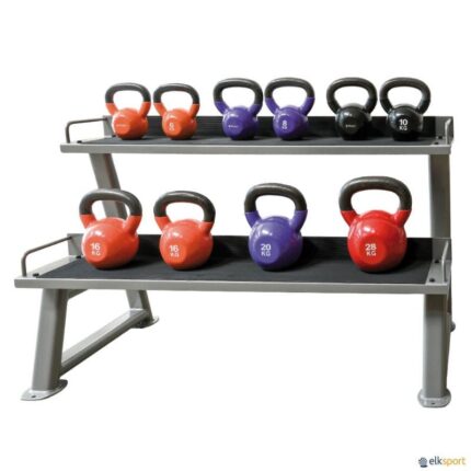 Permite armazenar kettlebells de diferentes tamanhos. Revestido a borracha para proteger as kettlebells. · Capacidade: 12 kettlebells. · Dimensões: 139 x 63 x 74 cm.