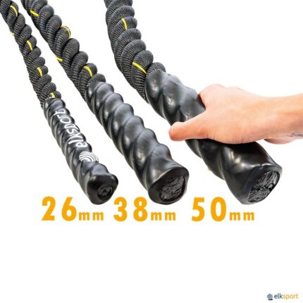 Corda funcional de treino fabricada em material sintético entrançado, muito durável, resistente à humidade e à abrasão, com fita protetora nas extremidades para evitar que se desfaça e oferecer uma melhor aderência. · 3 Diâmetros: 26 mm / 38 mm / 50 mm. · 3 Comprimentos: 9 m / 12 m / 15 m. Diâmetros da corda funcional: · 26 mm: Melhor aderência e mais leve, ideal para treino de iniciantes e para os mais jovens. · 38 mm: Aderência ergonómica e peso moderado, indicada para adultos. · 50 mm: Aderência de maior dimensão e peso mais elevado, para treinos de nível avançado. Comprimentos da corda funcional: · 9 m: Requer menos energia para criar as ondas, adequada para os mais jovens e para espaços pequenos. · 12 m: Maior comprimento implica um desafio adicional para manter a corda em movimento, ideal para treinos de adultos. · 15 m: Perfeita para treinos de elevada condição física.