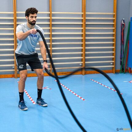 A corda funcional para saltar permite combinar o treino de força e o treino cardiovascular. Com esta corda, é possível realizar ambos os tipos de treino num só, uma vez que o seu comprimento e peso permitem saltar com ela. Fabricada com o mesmo material das cordas funcionais, possui uma fita protetora nas extremidades para evitar que se desfie e é revestida com uma capa protetora de nylon que a protege do desgaste e da abrasão. · Comprimento: 3 m · Diâmetro: 38 mm · Peso: 2,5 kg