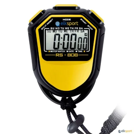 Cronómetro desportivo multifuncional com ecrã LCD e uma linha de grande visibilidade. Com  pilha alcalina incluída. Precisão de 1/100 segundos. 2 Memórias: tempo simples e tempo acumulado. Alarme. Calendário. 2 Cores: amarelo ou vermelho. Também vendido em mala com 10, 16 ou 24 cronómetros. A mala também pode ser vendida vazia.