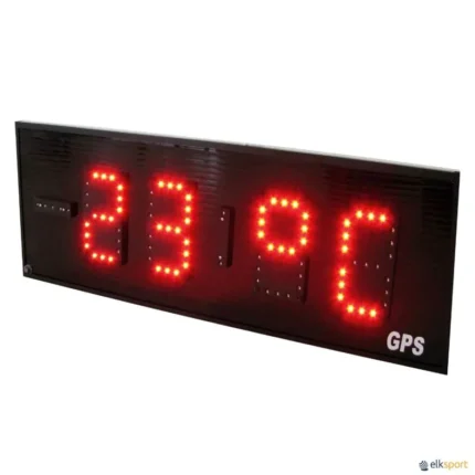Relógio eletrónico digital com LEDS, precisão de tempo por sinal de GPS. Para interior ou exterior. Mostra alternadamente a hora e a temperatura. Existe em 2 dimensões : - M : 100 x 33 cm - altura dos dígitos de 18 cm - L : 185 x 50 cm - altura dos dígitos de 33 cm. Ver também o cronómetro de ginásio