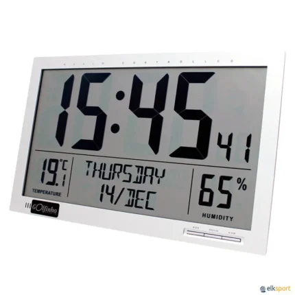 Relógio digital, com informação de temperatura e humidade. Termômetro: -10 a +50ºC (dígitos c/ 10,5cm de altura). Higrómetro: 20% a 99%. Aplicação: Parede ou mesa. Alimentação: 4 pilhas de 1,5V-AA. Peso: 880 gramas. Dimensões: 37 x 3 x 23 cm.