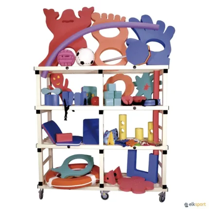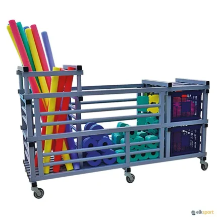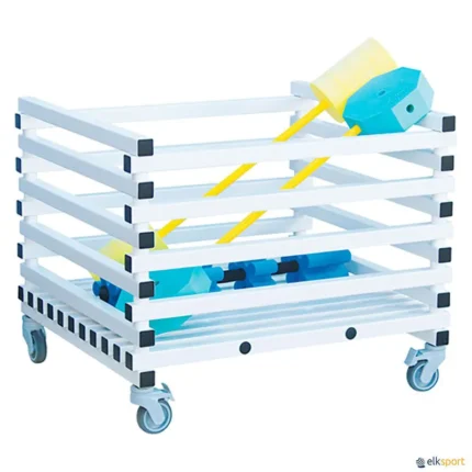 Carro para arrumação de halteres aquáticos, fabricado em tubo quadrado de PVC. Resistente à humidade, ácidos e gorduras. Com 4 rodas rotativas, 2 com travão. Dimensões: 140 x 40 x 125 cm. Entregue montado. Prazo de entrega: mínimo de 5 semanas.