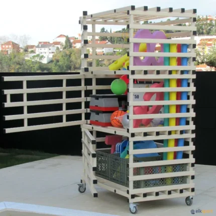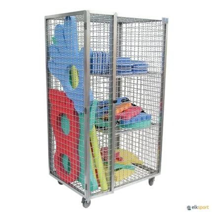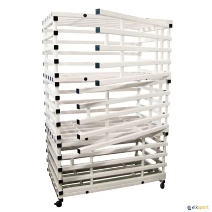 Fabricada em tubo de PVC quadrado. Resistente à humidade, ácidos, óleos e gorduras. Com 6 rodas giratórias para armazenar e deslocar o conjunto de barbatanas muito comodamente. Dimensões: 150 x 80 x 115 cm.