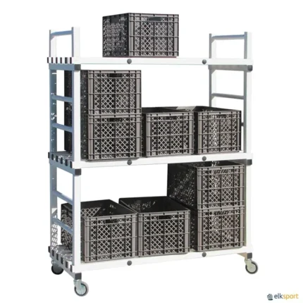 Estante em tubos de PVC quadrados, resistentes à humidade e aos ácidos, com 4 rodas de grande resistência. Perfeita para armazenar cestas de 60 x 40 x 40 cm. Dimensões: 138 x 62 x 170 cm Ver CESTA DOBRÁVEL MÉDIA.