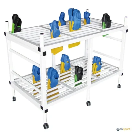 Fabricada em tubo de PVC quadrado. Resistente à humidade, ácidos, óleos e gorduras. Com 6 rodas giratórias para armazenar e deslocar o conjunto de barbatanas muito comodamente. Dimensões: 150 x 80 x 115 cm.
