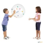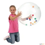 Bola transparente com pequenas bolas coloridas no seu interior, que favorecem novos estímulos nas atividades físicas adaptadas.