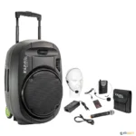 Sistema portátil de excecional qualidade sonora, equipado com uma bateria recarregável integrada. Fácil mobilidade graças ao seu carrinho retrátil e às rodas integradas de poliuretano com rolamentos de esferas. Inclui microfones sem fio VHF (de mão e de cabeça) e controle remoto. Indicado tanto para espaços interiores e exteriores. Entradas e saídas múltiplas para cobrir todas as necessidades e suportes digitais.
