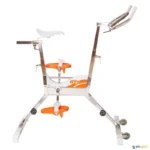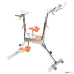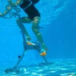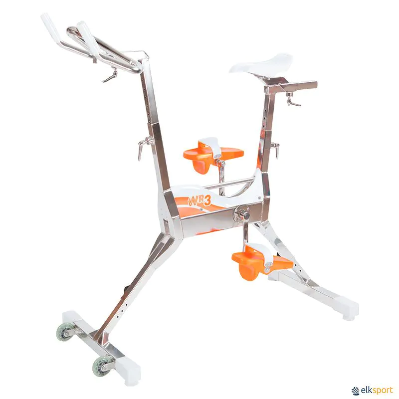 Bicicleta aquática fabricada em aço inoxidável AISI-316L, concebida com tecnologia Ergo-Ride, estudada para otimizar a biomecânica da pedalada e respeitar a anatomia, preservando as articulações.