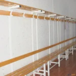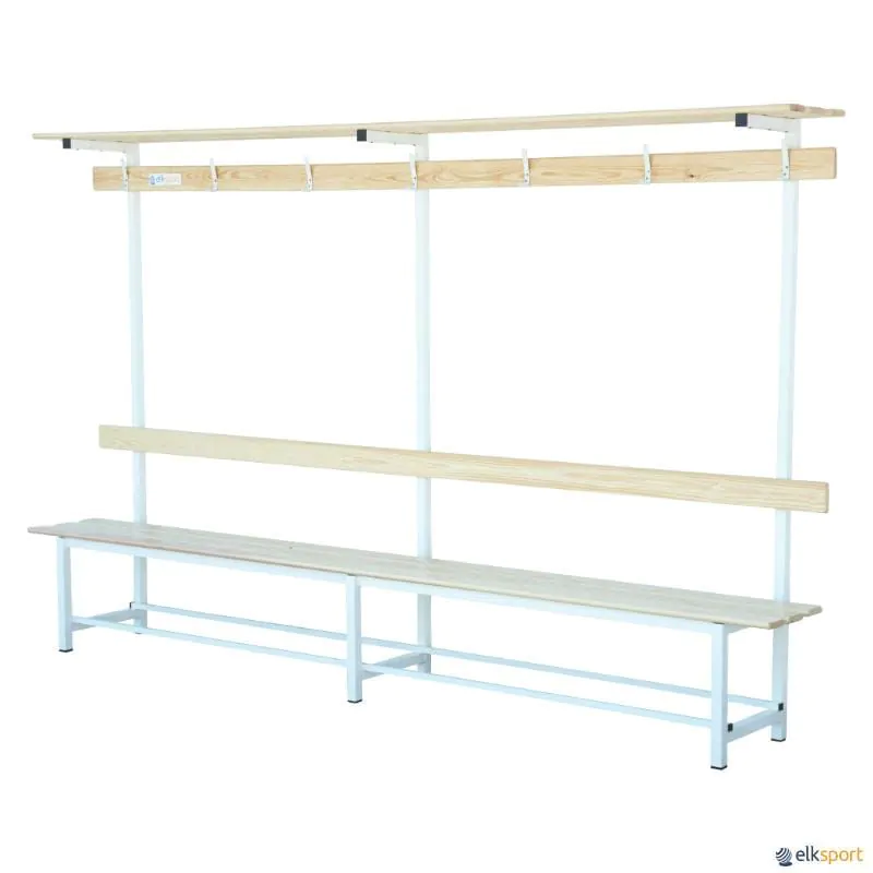 Banco de balneário completo sobre estrutura metálica, com tábuas de pinho, encosto, plataforma superior e cabides.