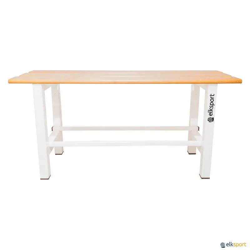 Banco fenólico com sapateira de 2 ripes. Material recomendado para balneários de piscina. Totalmente anti humidade, duradouro e robusto. Estrutura soldada em aço inoxidável tubo de 30 mm, pintado com epóxi. Taco em PVC. Variedade de cores disponíveis. Se não for especificado, será enviado na cor azul.