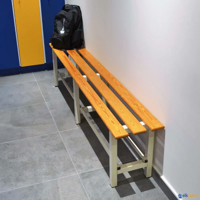 Banco de balneário completo sobre estrutura metálica, com tábuas de pinho, encosto, plataforma superior e cabides.