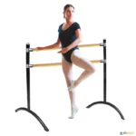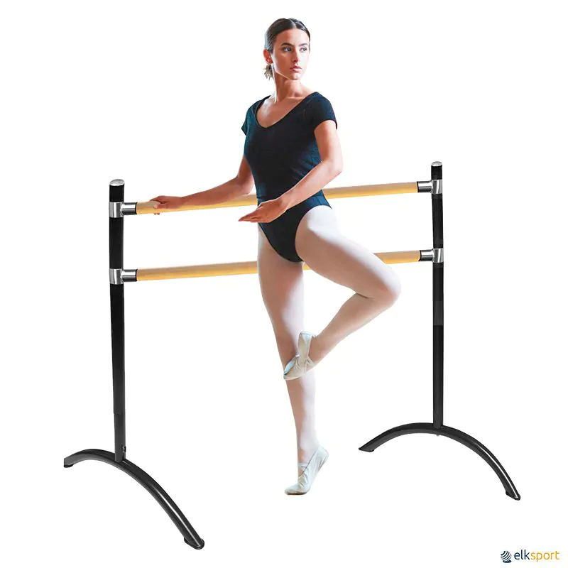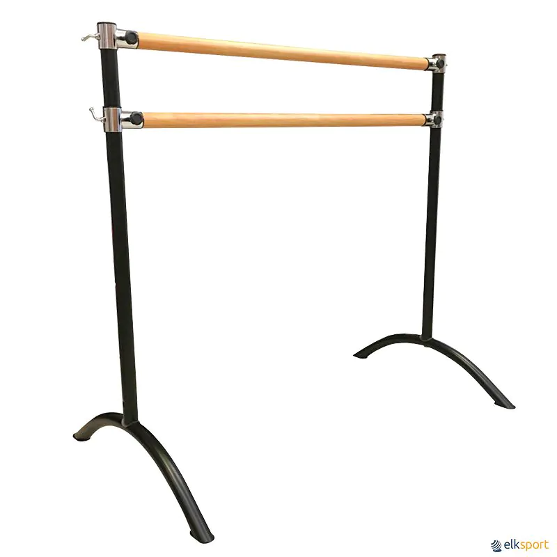 Barra de ballet portátil com barra dupla. Para realizar exercícios de barra, treinos de força versátil, massagem nas pernas, alongamentos de pé, etc. Ajuda a trabalhar os músculos dos braços, peito, costas e centro usando o peso do próprio corpo. A altura é ajustável para todas as idades. Fabricado em aço com acabamento epóxi. Decoração da barra metálica imitação madeira. Pés antideslizantes. Entregue desmontada.
