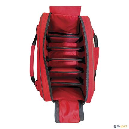 Bolsa + Recheio Básico: 20 compressas esterilizadas. 1 garrafa de água oxigenada. 1 garrafa de álcool 96º 250cc. 1 garrafa de tintura iodo de 125cc. 1 tesoura curva universal. 1 adesivo de tela de 5 m x 2,5 cm. 4 suturas adesivas de 3 x 76 mm. 20 Pensos rápidos de 19 x 72 cm. 2 Rolo tape rápido 2,5 cm. x 10 m. 5 pares de luvas descartáveis. 3 bolsas de frio instantâneo. 1 spray de frio de 400 ml. 1 pinça 14 cm reta. 1 banda coesiva de 7,5 cm. x 4,5 m. 2 bandas elásticas de crepe 7 cm. x 4 m.