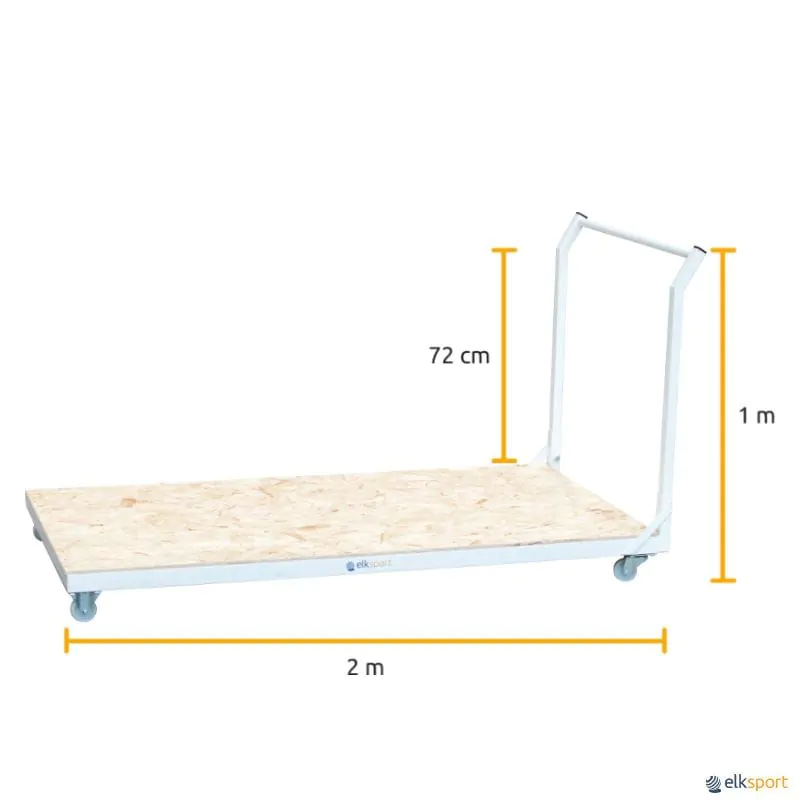 Carro robusto com base em madeira, montada sobre uma forte estrutura de aço, com pintura anti corrosão. Rodas giratórias com 100 mm de Ø.