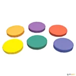 O conjunto é formado por: 6 discos em 6 cores (amarelo, azul, laranja, vermelho, verde e violeta).