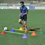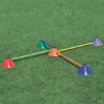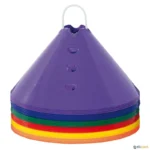 Jogo de 24 cones em plástico flexível de 15 cm de altura e Ø 30 cm. Com recorte para apoio de bastão no topo  e mais 12 orifícios laterais, em 3 alturas, que permitem pousar um bastão. Ao serem atingidos durante o exercício, os bastões caem ao chão, evitando assim quedas ou tropeções dos atletas.