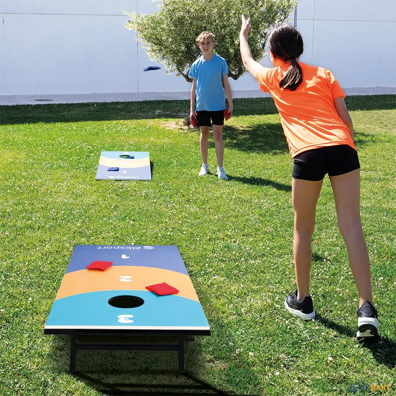 Este jogo popular é praticado entre 2 equipas, onde os jogadores lançam sacos para uma plataforma inclinada com um buraco numa extremidade. O objetivo é enfiar o saco no buraco ou fazê-lo ficar sobre a plataforma. O jogo é alternado entre as equipas a partir de uma determinada distância. Ganha a equipa que alcançar 21 pontos. É um jogo conhecido pelo seu ambiente descontraído e festivo, oferecendo diversão inclusiva para todas as idades e habilidades. Os tabuleiros mais resistentes do mercado, são fabricados com uma estrutura de aço soldada e uma tampa de MDF (semelhante às mesas de ping-pong) para garantir que os tabuleiros durem jogo após jogo sem deformação. As pernas de aço dobram-se para melhor armazenamento e transporte. Os gráficos do tabuleiro permitem variações no jogo para aumentar as oportunidades de pontuação, estratégia e competição.