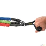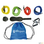 Kit composto por: 4 elásticos de 120 cm com mosquetão em 4 densidades (Ligeiro, média, forte e super forte), 2 braceletes acolchoadas, 2 pegas para elásticos e bolsa de transporte. Pode-se aumentar a intensidade do exercício incrementando elásticos nas pegas.